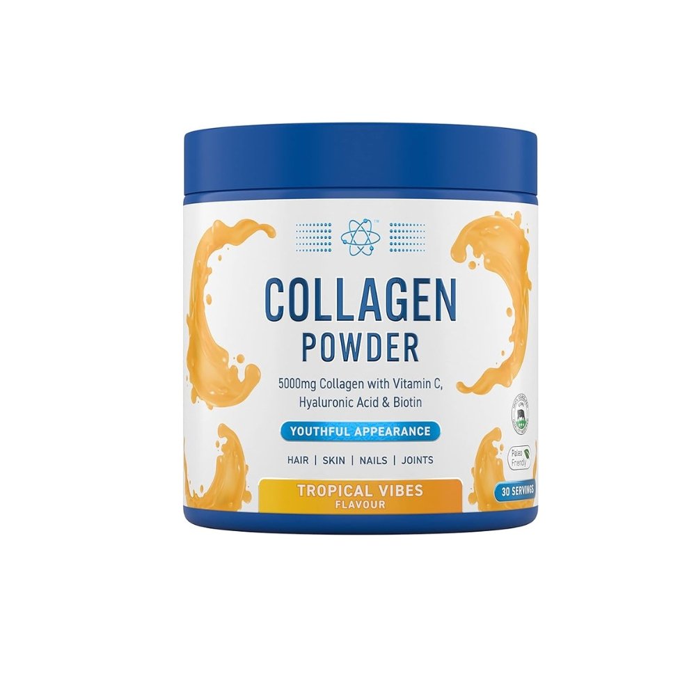 Applied Nutrition Collagen Powder in Tropical Vibes is a premium supplement delivering 5 g of high-purity, bio-active type-I bovine collagen per serving, enriched with Vitamin C, Hyaluronic Acid, and Biotin to support skin elasticity, strong joints, and vibrant hair and nails. Infused with a juicy, light tropical flavor, it mixes easily into cold water, smoothies, or yogurt. Free from fat, sugar, and cholesterol, and formulated without soy or dairy, it’s a clean, halal-certified way to boost your beauty and wellness routine.