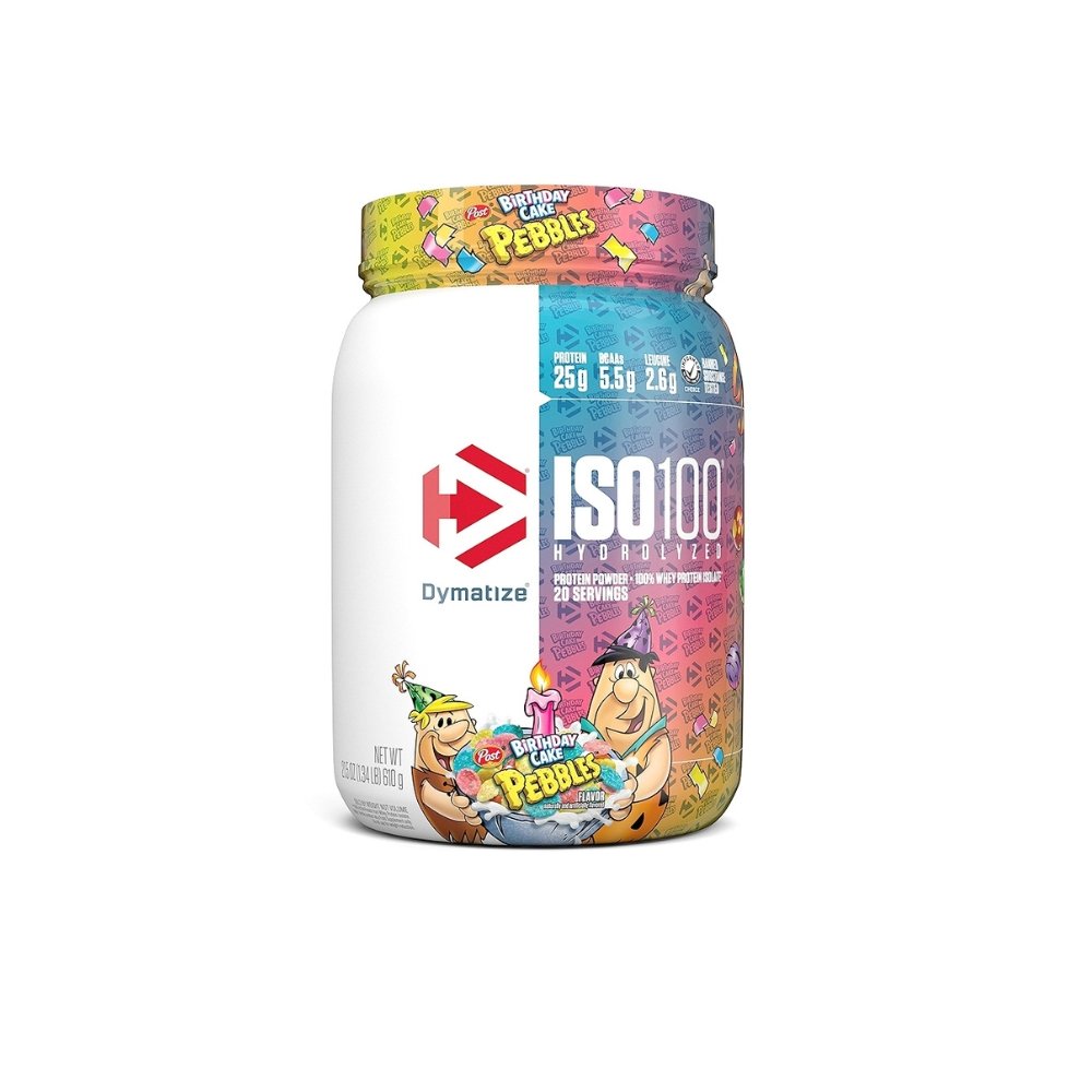 Dymatize ISO100 Birthday Cake Pebbles is a special edition hydrolyzed 100% whey protein isolate powder featuring a unique Post Pebbles cereal-inspired flavor. Each 1-pound container provides 20 servings with 25g of protein, 5.5g BCAAs, and 2.6g leucine per serving. Key features: